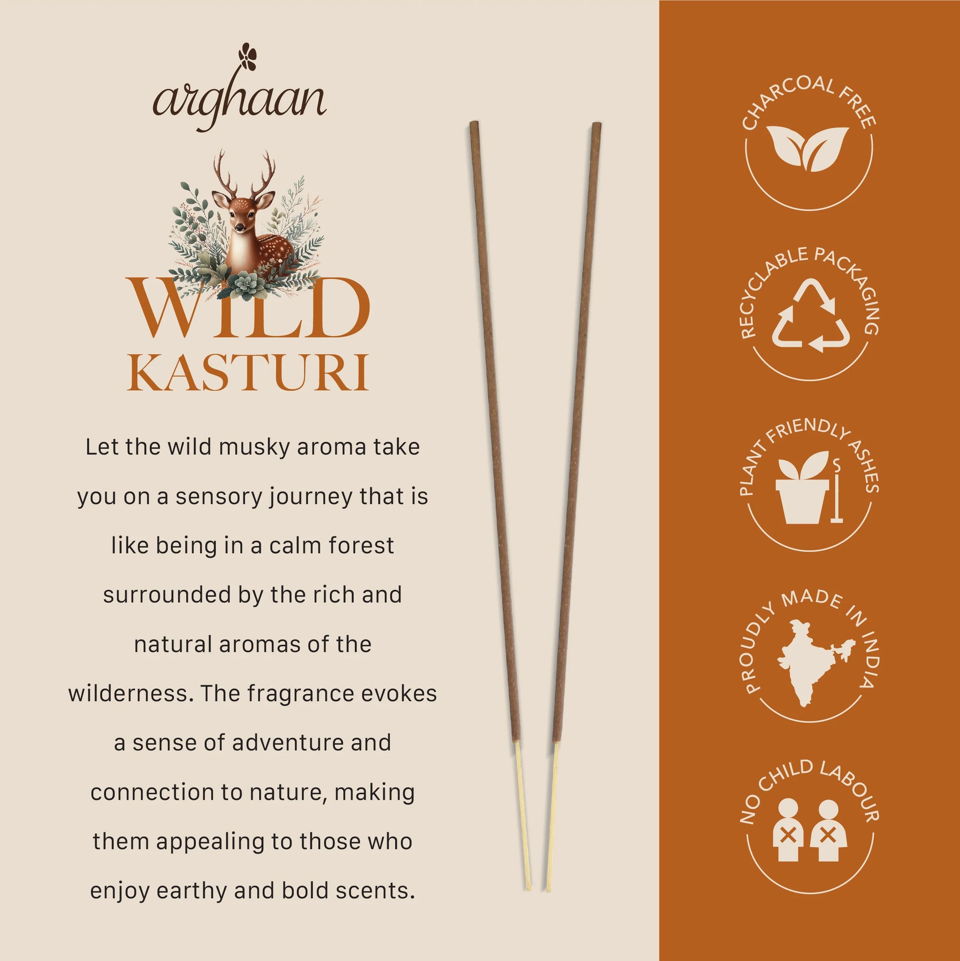 Bring the serenity of wild forests into your home with Arghaan Wild Kasturi Premium Incense Sticks. Infused with a bold, musky aroma, these charcoal-free incense sticks transport you to a place where the richness of nature meets peaceful stillness.