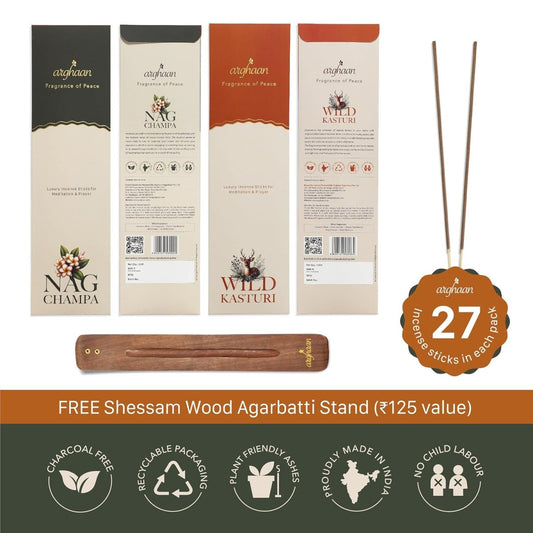 Arghaan Charcoal-Free Luxury Incense Sticks Combo – Kasturi & Nagchampa | Meditation & Prayer Incense for Home & Office | 54 Sticks (27x2) + Free Sheesham Wood Holder | Natural, Eco-Friendly, Low Smoke