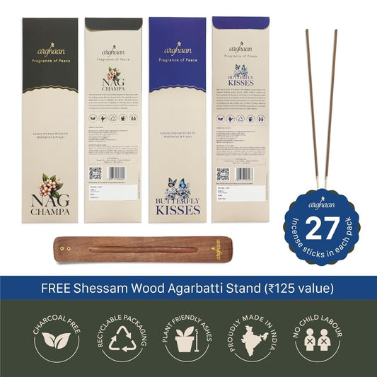 Arghaan Charcoal-Free Luxury Incense Sticks Combo – Butterfly Kisses & Nagchampa | Meditation, Prayer & Relaxation Incense for Home & Office | 54 Sticks (27x2) + Free Sheesham Wood Holder | Natural, Eco-Friendly, Low Smoke