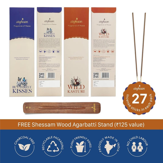 Arghaan Charcoal-Free Luxury Incense Sticks Combo – Butterfly Kisses & Wild Kasturi | Meditation, Prayer & Relaxation Incense for Home & Office | 54 Sticks (27x2) + Free Sheesham Wood Holder | Natural, Eco-Friendly, Low Smoke