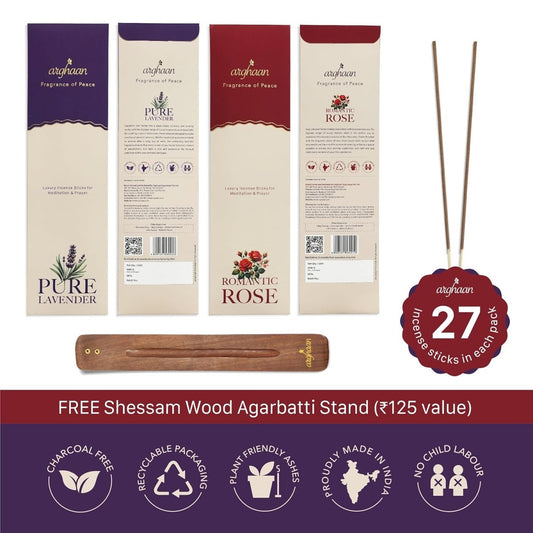 Arghaan Charcoal-Free Luxury Incense Sticks Combo – Rose & Lavender | Meditation, Prayer & Relaxation Incense for Home & Office | 54 Sticks (27x2) + Free Sheesham Wood Holder | Natural, Eco-Friendly, Low Smoke