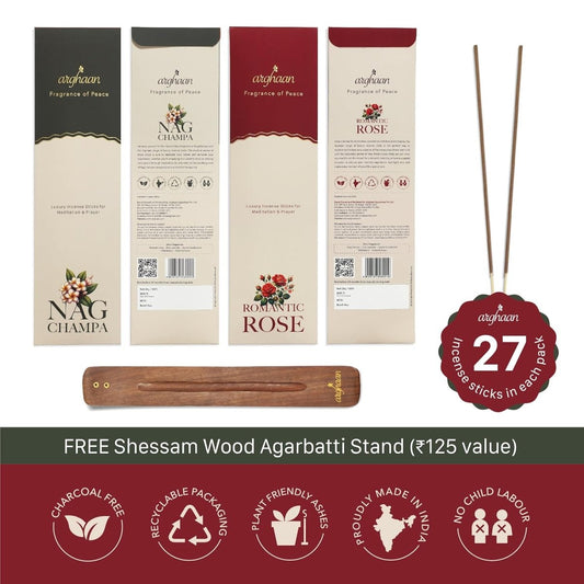 Arghaan Charcoal-Free Luxury Incense Sticks Combo – Rose & Nagchampa | Meditation, Prayer & Relaxation Incense for Home & Office | 54 Sticks (27x2) + Free Sheesham Wood Holder | Natural, Eco-Friendly, Low Smoke