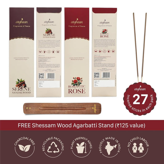 Arghaan Charcoal-Free Luxury Incense Sticks Combo – Rose & Sandalwood | Meditation & Prayer Incense for Home & Office | 54 Sticks (27x2) + Free Sheesham Wood Holder | Natural, Eco-Friendly, Low Smoke